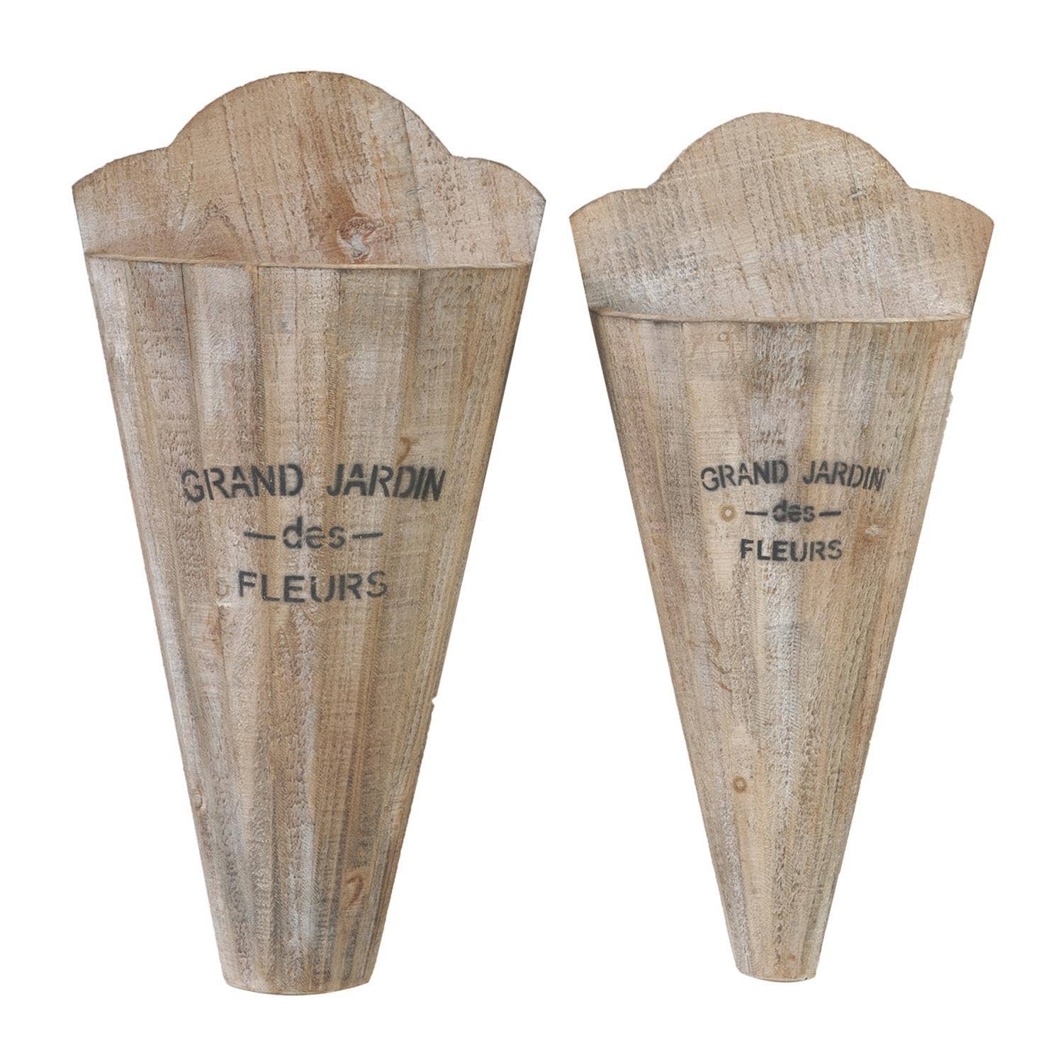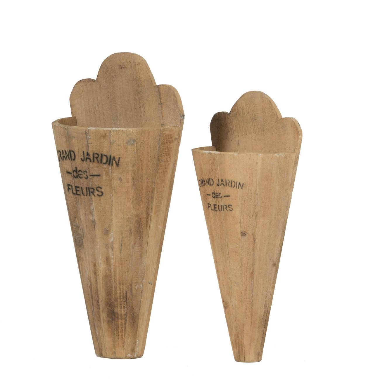 These conical wall planters offer a natural way to display fresh flower cuttings. The phrase stamped on the front – grand Jardin des fleurs – translates from French to “large garden of flowers," and these planters make it easy to transform any area of your home into a private garden of your own. Each set includes two coordinated planters for creative display possibilities.