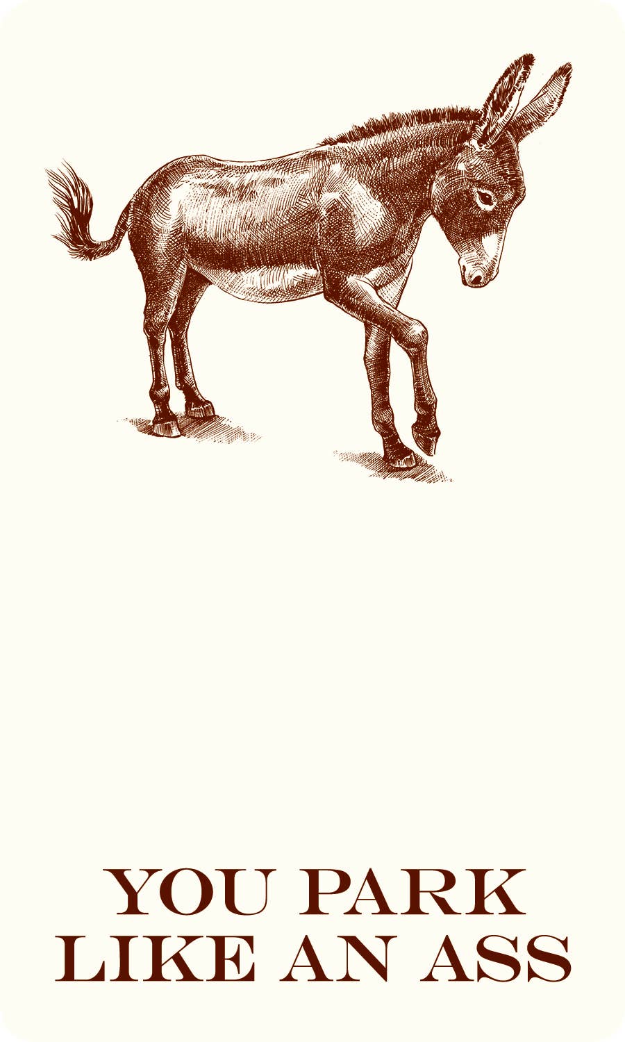 When you can’t conjure up the perfect words to articulate your true feelings about some Jackass's parking job, why not tell them how you really feel (in style!?) My cheeky donkey illustration is flat printed with an environmentally friendly, soy-based ink on premium, USA-made, Ecru textured Laid 80# Cover stock paper. All of my Cards are designed and proudly printed in New Orleans.