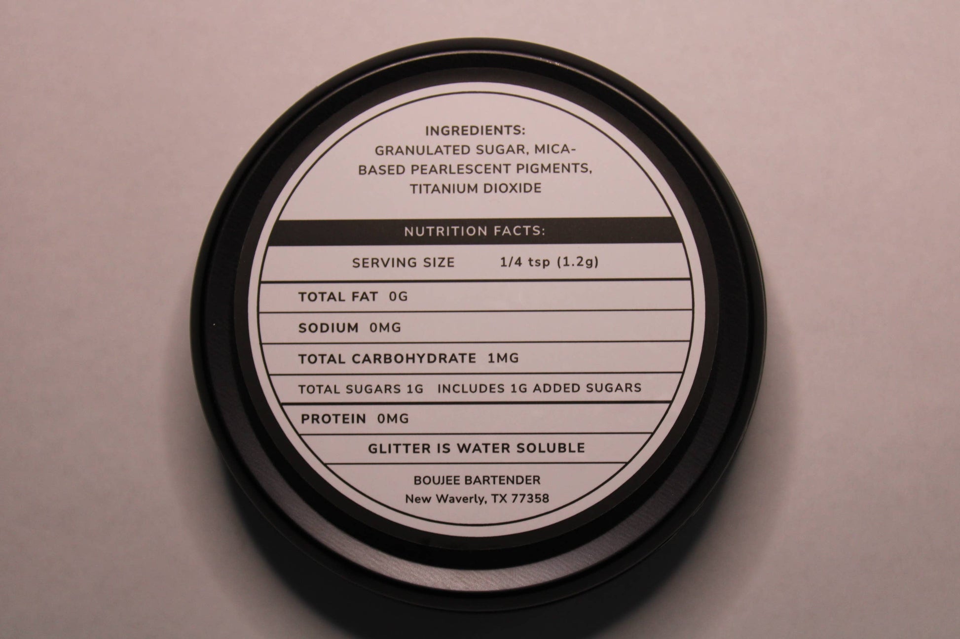 Our Sweet Rimming Glitter is the perfect rimmer to make the rim of a cocktail or mocktail glass truely sparkle! Its 100% edible and gluten free. This isnt the chunky rimming sugar that "shines", this is a fine sweet very sparkly rimming glitter that doesnt disrupt the taste of the beverage with a crunch. Our 4oz containers rim approx. 40-50 glasses.