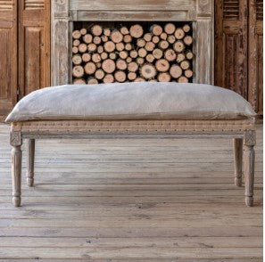 The Leland bench has a stylish and comfortable pillow atop a sturdy bench with carved wood and stitched details. We love this piece for a unique dining room seating statement or for the family room.