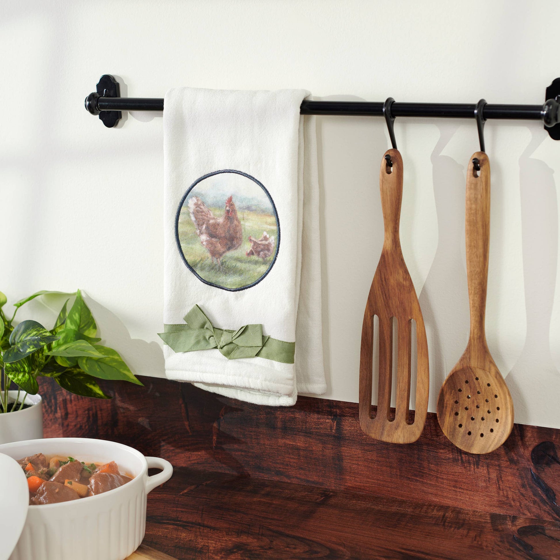 A cotton kitchen towel from our Farmhouse Collection featuring a farm animal inspired design with a stitched art panel and green ribbon accent. Art panel displays a charming scene of chickens in a field replicated from original artwork painted onto burlap canvas, giving the art a unique depth and texture. Chicken kitchen towel features a terrycloth layer on the back for added absorbency. Our Chickens kitchen towel is conveniently machine-washable for easy cleaning. Farm kitchen towel is packaged on a cardboard hanger with hole to easily display on rack. A rustic farm-themed kitchen accessory perfect for everyday use.