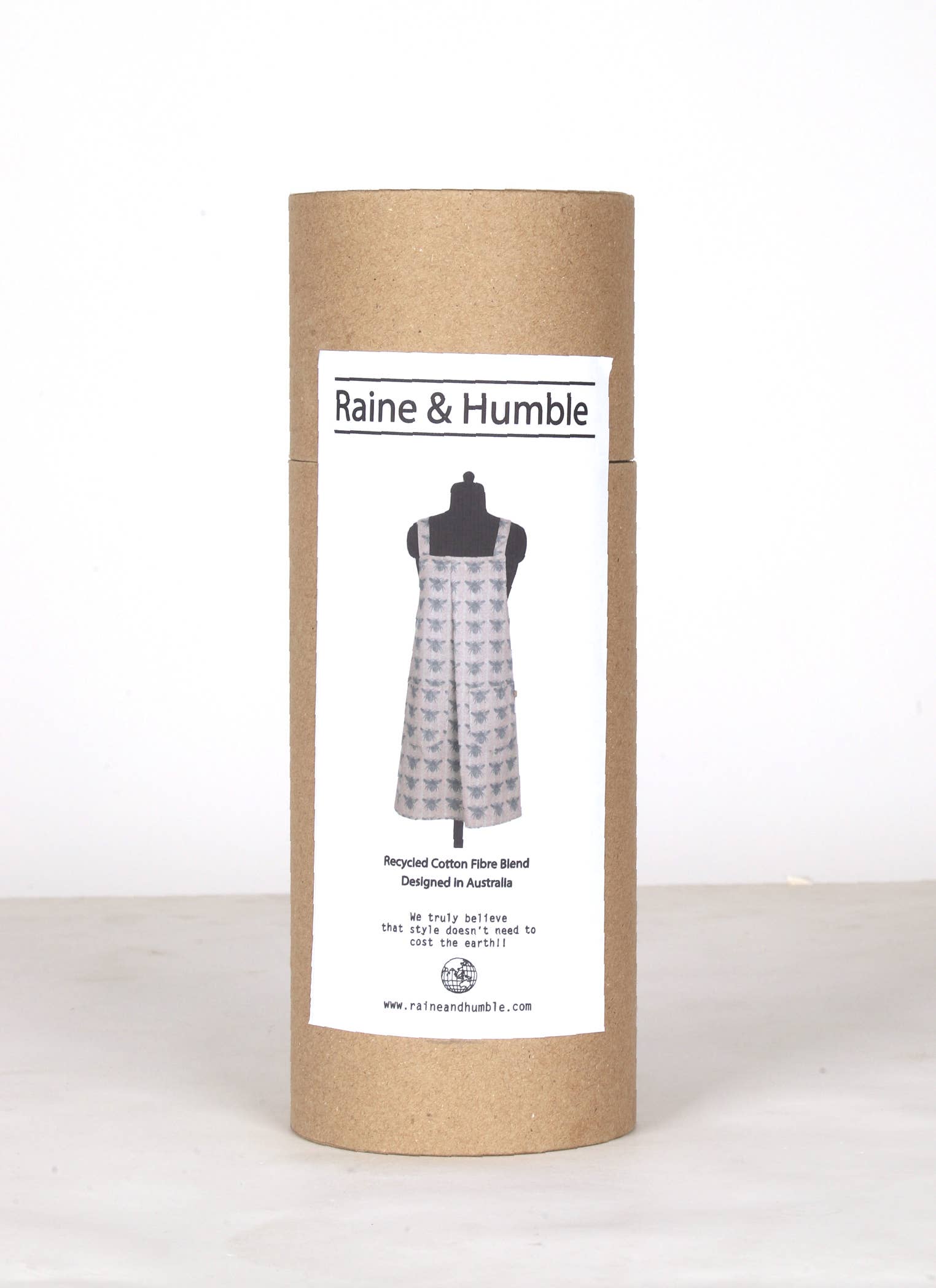 This new Bee Pinafore style apron design was inspired by our very popular Abby Bees designs. It coordinates with the new Blue Haze Bee Oven Gloves, napkins, and tea towel. The generously sized long pinafore style fits most. Two pockets. Made of 100% recycled cotton. Packaged in a recyclable cardboard canister for easy display and great gift giving.