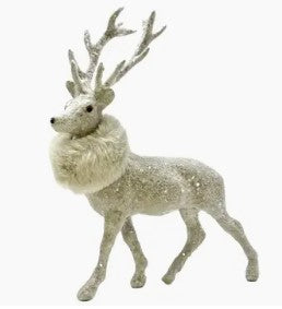Meet our fabulous dove-colored Rudy, the star of the winter wonderland! He's the epitome of holiday sparkle, wrapped in a lustrous coat of shimmering glass glitter. His nose glows like a precious ruby, adding a touch of magic to his already charming presence. Rudy also wears a dove-colored faux fur scarf because Rudy shines bright in the coldest winters. Sleigh the holiday season with this dashing and debonair reindeer by your side!