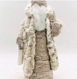 Santa's glittered pink nose pops through his full-length spotted faux-fur coat and matching hat; holding a tiny glittered brushy tree and a shopping bag.